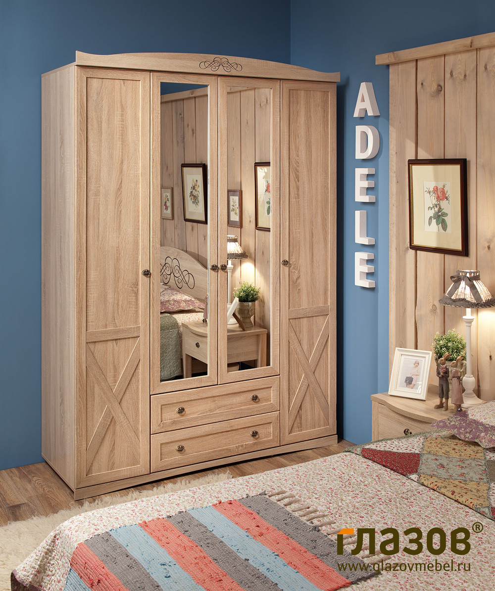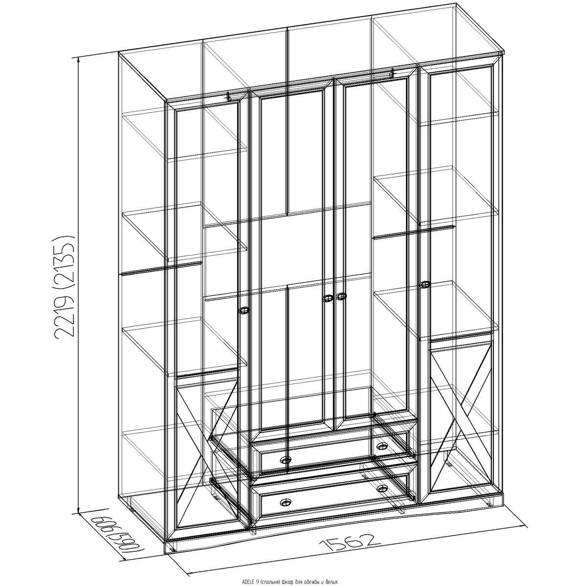 Вместительные шкафы позволят разместить в спальне весь Ваш гардероб. ADELE 9 Шкаф для одежды и белья выигрышно смотрится с карнизом, который придает шкафу изюминку и подчеркивает выбранный стиль Прованс, но и без него, с декоративной раскладкой на дверцах, выглядит тоже прекрасно.