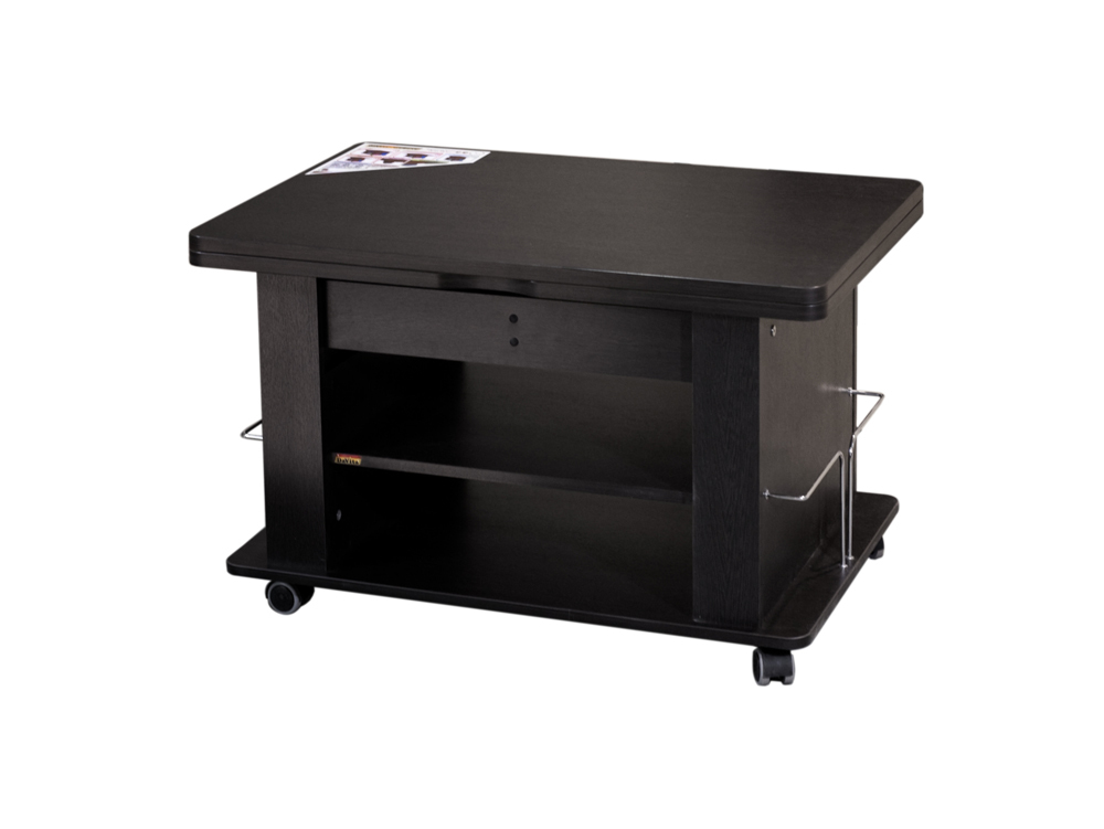 «Агат 19.2» – многофункциональный стол, который может использоваться в различных положениях, представленных на схемах. Это достигается за счет наличия подъемного и поворотного механизмов, которые превращают журнальный стол в обеденный. Данную модель дополняет металлическая газетница и ниша для хранения мелочей.