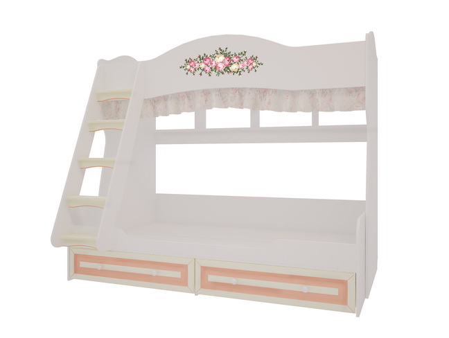 2-ярусная кровать из серии «Алиса» – компактный и изысканный уголок Франции в Вашем доме! Кровать выполнена в нежных цветах: белый, крем и розовый. Фасадные элементы выполнены из крашеного МДФ и украшены классической фрезеровкой с патиной и рисунком из роз. 2-ярусная «Алиса» предусматривает два спальных места: нижнее, для матраса размером 1200х1900 мм, и верхнее – 800х1900 мм. Комплектуется удобной безопасной лестницей, на ступенях антискользящее покрытие. В «Алисе» достаточно мест для хранения игрушек: удобные полки декорированы легкой съемной шторкой, и вместительные выдвижные ящики.