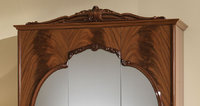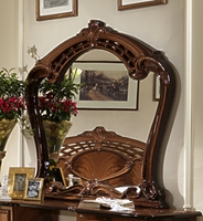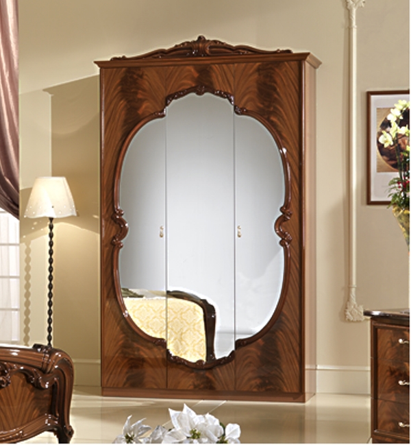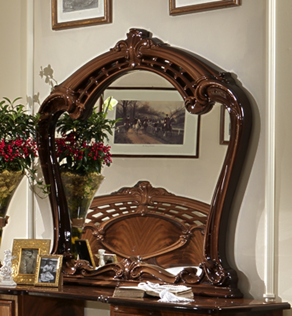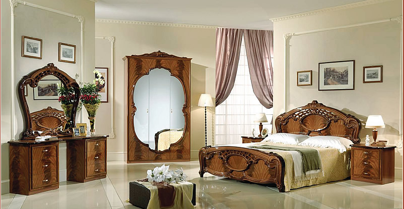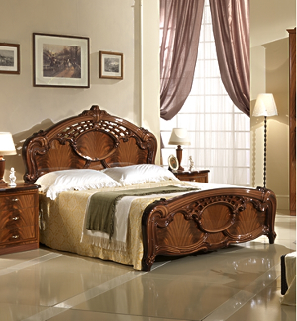 Кровать с красиво украшенными изголовьем и изножьем выглядит солидно. Все лицевые поверхности шкафа, комода, тумб, кровати покрыты высокоглянцевым лаком. А специально подобранные декоры красного дерева (могано) и ореха сияют при естественном и домашнем освещении.