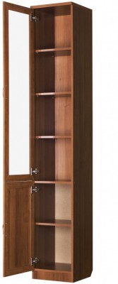 Шкаф разделен на две части. Верхняя часть спроектирована с застекленной дверцей и четырьмя полочками. Полочки одинаковые по размеру и находятся на равном расстоянии одна от одной. Расположены они таким образом, чтобы в шкафу было удобно хранить не только обычного формата книги, но и большие по размерам печатные издания или папки с документами (что очень удобно, если шкаф приобретается для использования в офисе). Благодаря внушительному объему, на полочках можно хранить большое количество книг.