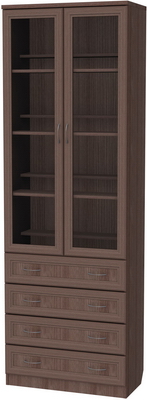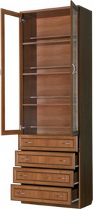 Нижняя часть шкафа оснащена четырьмя выдвижными ящичками. Аналогично, как и полки, ящики одинаковы по площади и высоте. В ящиках очень удобно хранить разнообразные мелочи, которые всегда нужны под рукой, а если шкаф будет установлен в спальной комнате, то в ящичках можно хранить постельное белье или одежду. Благодаря качественным современным механизмам, ящички легко скользят и открываются. Весь шкаф декорирован фурнитурой, воссоздающей классический стиль мебели, именно благодаря этому шкаф и будет прекрасным дополнением в любой комнате. Особенно выгодно использовать шкаф в комнате небольшого размера, поскольку, несмотря на свою вместительность, шкаф обладает действительно компактными размерами. Большой объем обеспечивается длинной и высотой шкафа.