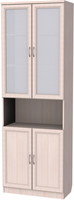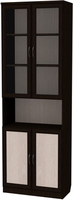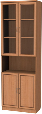 Визуально шкаф разделен на две части: верхнюю и нижнюю, между которыми находится дополнительная полочка. Верхняя часть спроектирована с четырьмя полками, которые абсолютно одинаковы как площадью, так и по расстоянию. Полочки закрыты стеклянной дверью. В зависимости от ваших желаний, вы сможете заказать шкаф, в котором стандартные деревянные полки будут заменены на стеклянные, а задняя деревянная стенка – на зеркальную. Полочки обладают достаточно большой площадью, благодаря чему на них можно разместить довольно много книг, причем с легкостью можно поместить книги любого формата, от самых маленьких до самых больших по размерам изданий.