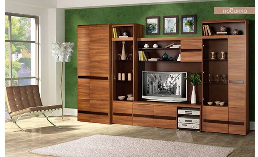 Модульная гостиная «София» - выполнена в минималистском дизайне с использованием выразительной древесной текстуры декора, чем и привлекает к себе внимание. Стеклянные полки подсвечиваются. Другой особенностью серии «София» являются ручки, изготовленные из МДФ  и спроектированные на всю ширину фасадов.