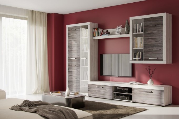 Изюминка данного набора - котрастное  сочетание цветов и текстур. Большре количество мест для хранения, компактность и цветовое решение сделают Вашу готиную не только функциональной, но и очень уютной.