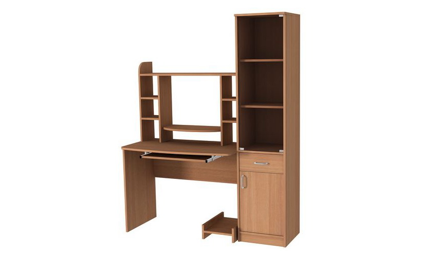 Стол с прямым расположением столешницы оборудован выдвижной полкой под клавиатуру, нишей под системный блок и тремя открытыми полками. Надстройка образует нишу под монитор и оснащена множеством полочек для хранения необходимых вещей. На верхней полке можно разместить принтер.