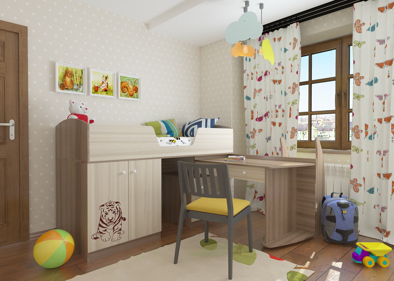 Комплекс сочетает в себе функции 3 в 1: есть место для хранения вещей с комодом и шкафом, место для учебы и творчества, и комфортное место для сна. Рабочий стол с выдвижными ящиками при необходимости компактно задвигается под спальное место, что экономит пространство в комнате. Спокойная цветовая гамма комплекса подойдет к любому интерьеру, а принт с веселым тигренком напомнит детям о бережном отношении к природе.