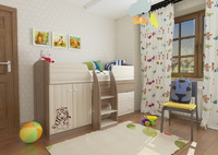 Состоит из: спального места, рабочего стола и шкафа и комода для одежды. Сборка универсальная.