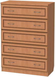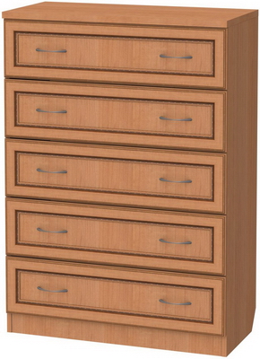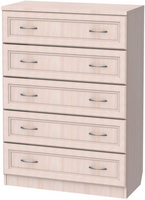 Данный предмет мебели при небольших габаритах (всего 790х370 миллиметров ширины и длины) имеет высоту в 1113 миллиметров, чем обеспечивается его внушительная вместительность. Комод оснащен пятью достаточно большими выдвижными ящичками, в которых можно держать любые вещи, будь то крупные постельные принадлежности, небольшие полотенца или любые другие необходимые предметы. Выдвижной механизм состоит из металлических и пластмассовых элементов, способных без поломок выдерживать сотни открываний, поэтому не стоит волноваться, что предмет мебели в процессе эксплуатации быстро придет в негодность. Ящички оснащены металлическими ручками, которые благодаря немного изогнутой форме очень удобно ложатся в ладонь. Дополнительную изысканность комоду придают строгие четырехугольные декоративные каемки по периметру каждого сегмента.