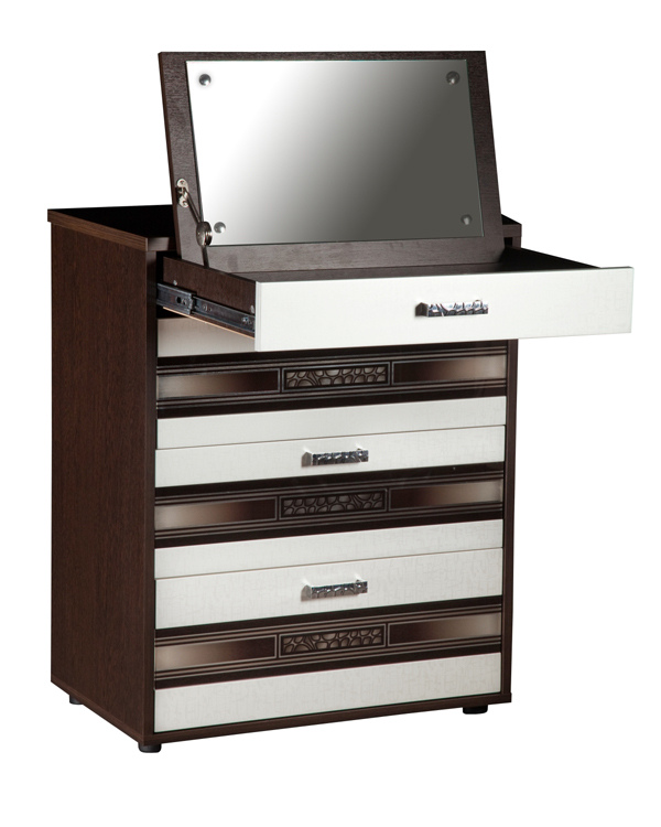Небольшой, но вместительный комод «Валенсия 35.09» является частью модульного набора мебели для гостиной «Валенсия». Особенность этой модели в том, что в верхнем ящике находится откидное зеркало. Комод можно использовать не только в сочетании с другими модулями, но и как отдельный элемент в спальне – в качестве туалетного столика.